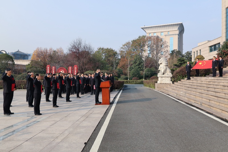 仪式在激昂的国歌声中拉开序幕,全体人员整齐肃立,举行升国旗仪式。随后,领誓人左手抚按宪法领诵誓词,该院新任职干部、新晋升干警和新入职干警等列队站立,他们手持《中华人民共和国宪法》,右手举拳,庄严宣誓,表达对宪法的忠诚、对法治的坚守和对人民的承诺。